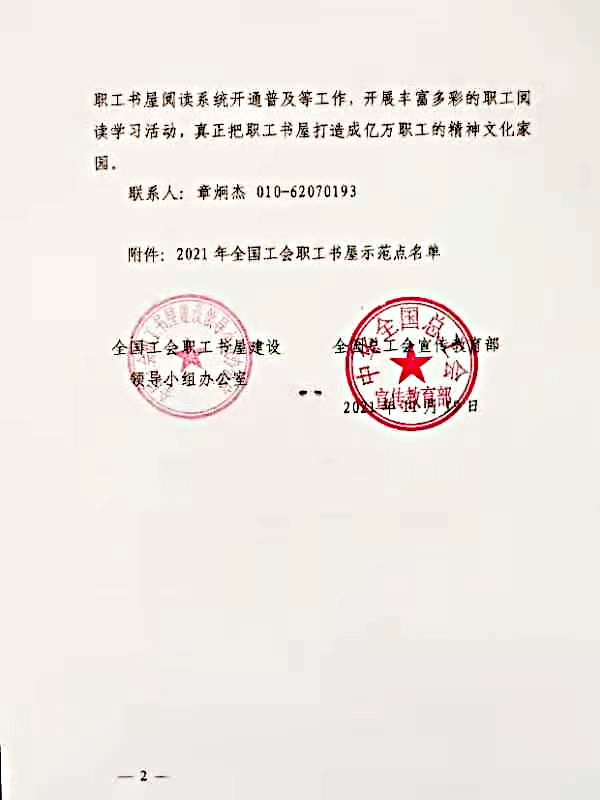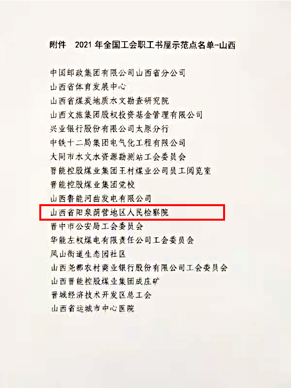 近日,中华全国总工会下发《关于命名2021年全国工会职工书屋示范点的通知》,荫营地区检察院职工书屋获评“2021年全国工会职工书屋示范点”。此次山西省共有18个单位获选,荫营地区检察院是全省检察机关唯一获选的单位。