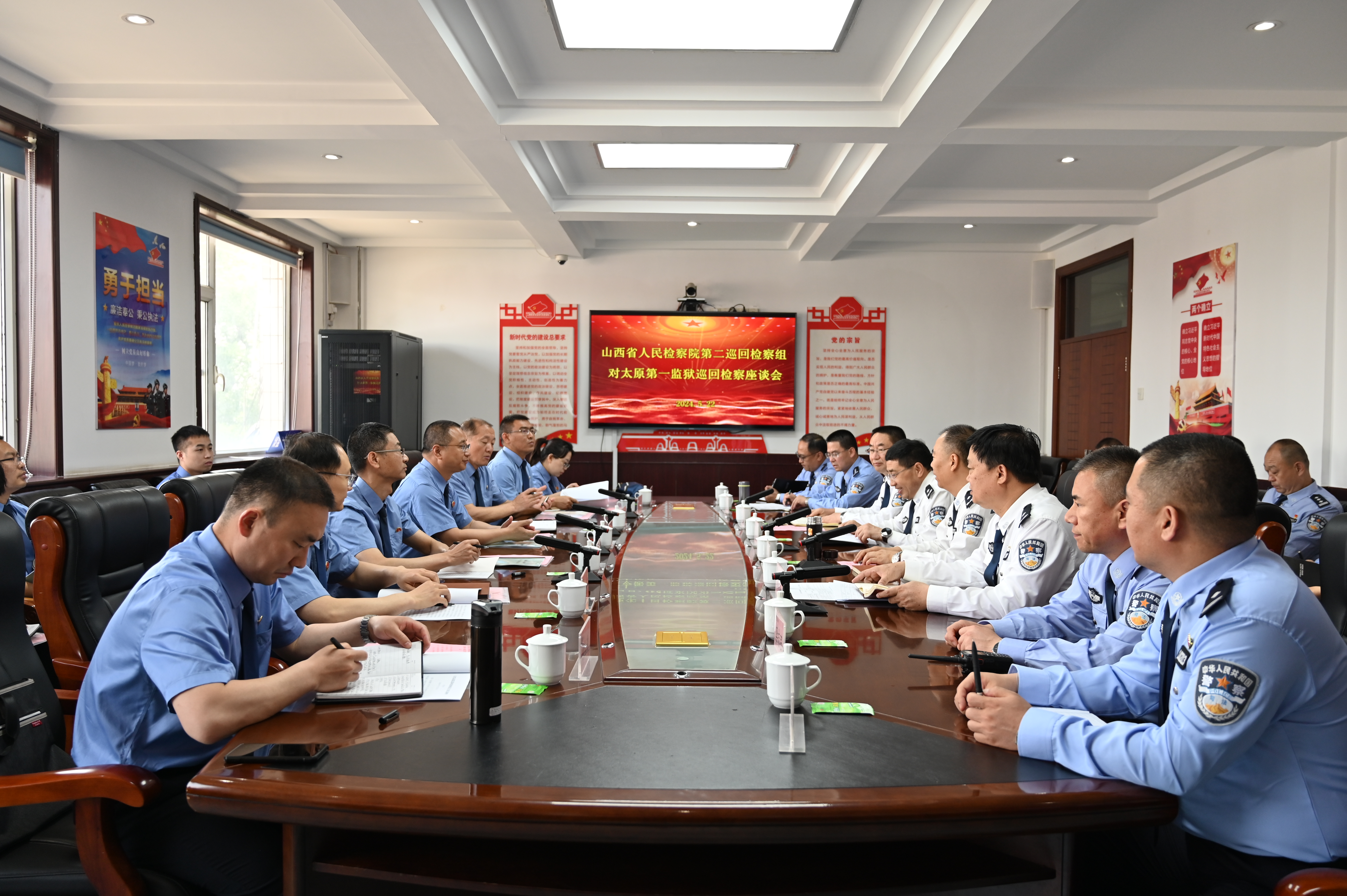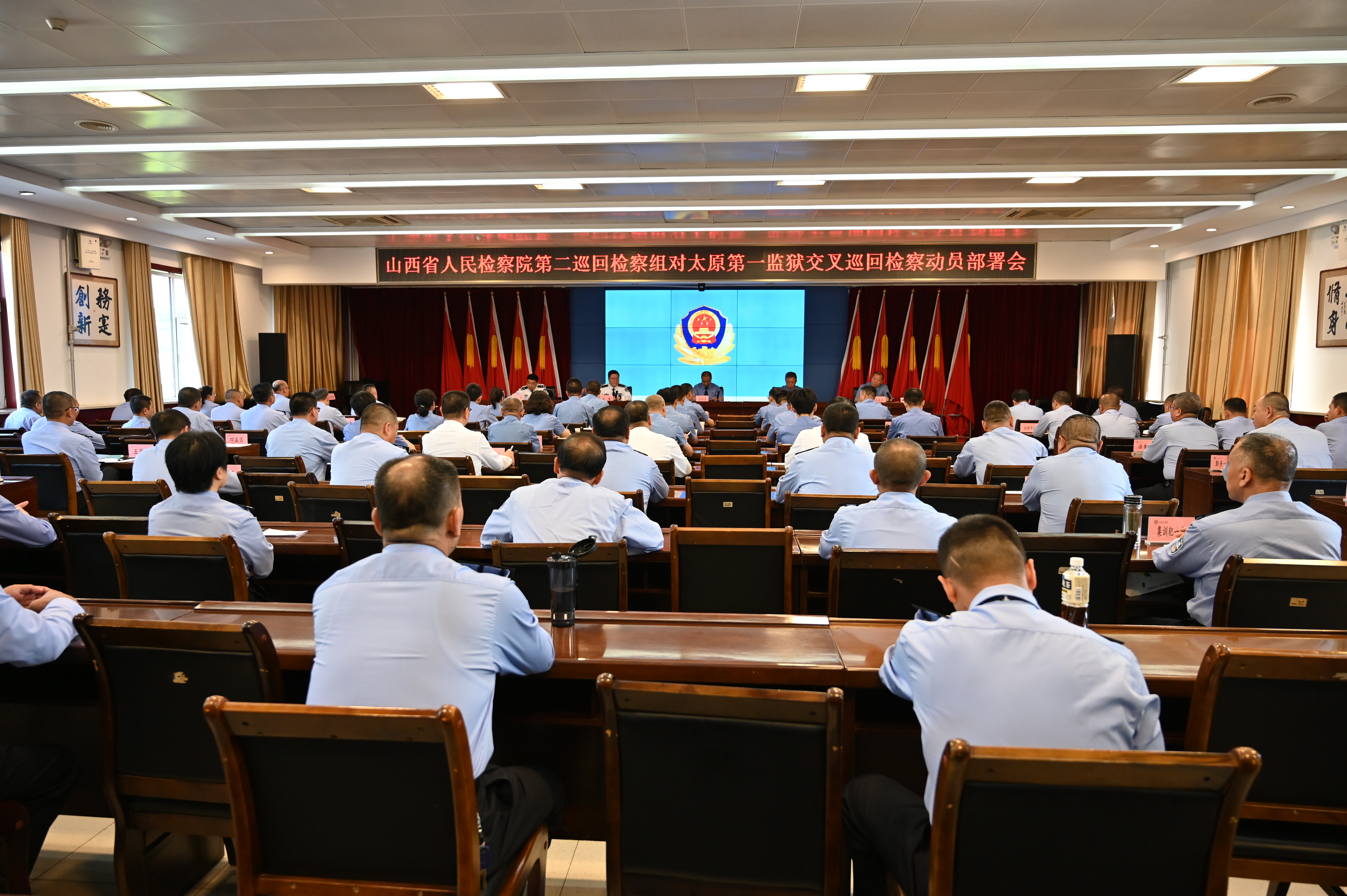 为贯彻落实省院对2024年度巡回检察工作的总体部署,高质效推进巡回检察走深走实,5月22日,由山西省阳泉荫营地区人民检察院组成的山西省人民检察院第二巡回检察组进驻太原第一监狱,并组织召开交叉巡回检察动员部署会。 第二巡回检察组组长、荫营地区检察院党组书记、检察长付利宝出席会议并讲话。山西省监狱管理局总工程师孙健,西峪地区检察院党组书记、检察长石全鹿,太原第一监狱党委书记、监狱长宋志平及领导班子成员、各职能科室、各监区负责人以及巡回检察组全体成员参加会议。宋志平监狱长主持会议。